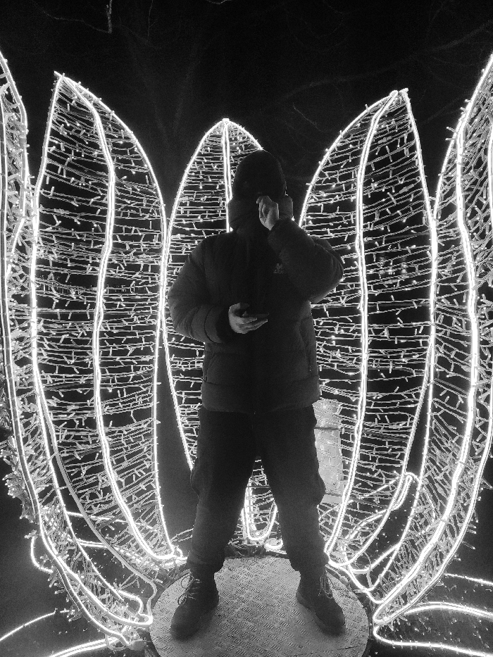 A person in dark clothing and a hood stands center frame, surrounded by illuminated, stylized flower-like structures. The figure holds a phone in one hand and is adjusting something near their ear with the other. The scene is dark, highlighting the bright white outlines of the floral arrangement. The subject appears to be standing on a round, metallic surface. The image is in black and white.