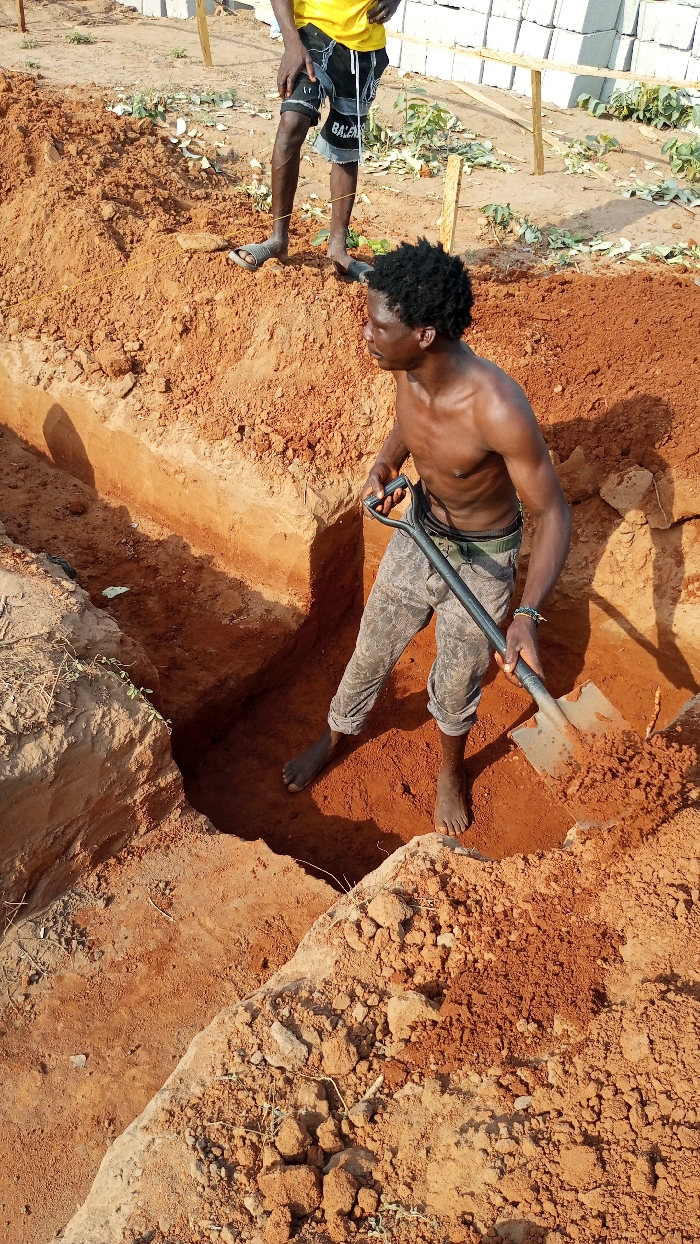 The image displays an outdoor construction site in Zango-ndaji, Nigeria, under sunny conditions. In the foreground, a shirtless male with dark, curly hair and dark skin stands barefoot within a rectangular trench dug into reddish-brown soil. He holds a black-handled shovel, its metal blade containing loose reddish-brown earth. He wears light-colored, patterned trousers. Partially visible in the upper background, a second male stands on the ground level, wearing a yellow t-shirt, dark patterned shorts, and sandals. Piles of loose reddish-brown soil are accumulated around the edges of the trench. In the distance, stacks of light-colored concrete blocks are visible, along with scattered sparse green vegetation and wooden stakes. A thin yellow string or line stretches across the ground near the second male's feet.