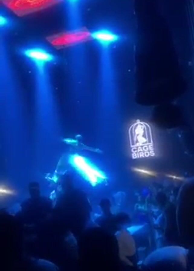 dimly lit nightclub or event space filled with people, likely dancing and socializing. Above the crowd, an acrobat, suspended on some type of rigging, performs. Lighting effects include bright blue spotlights directed downward and red lighting fixtures overhead. A logo that says “CAGE BIRDS” is visible.