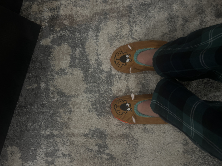 A top-down shot shows a person's feet in brown Scooby-Doo slippers, clad in green and black plaid pants