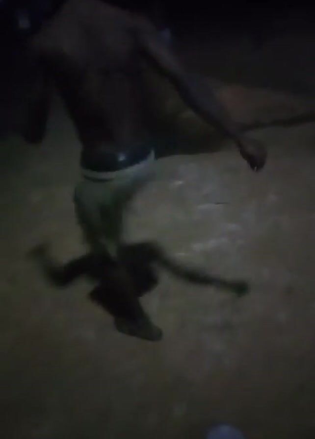 A person with no shirt and wearing shorts stands outside. The person is moving and appears to be shadowboxing. The scene is dark with minimal lighting.