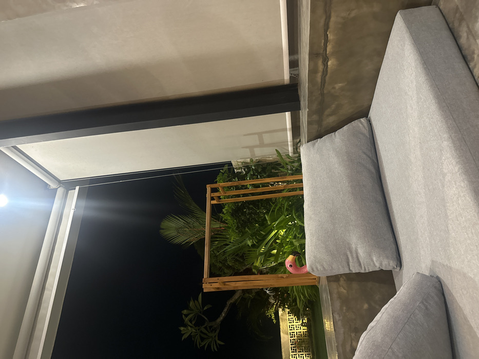 The image displays an outdoor or semi-outdoor seating area at night in Tumbak Bayuh, Indonesia. In the foreground, a grey, upholstered lounge sofa with multiple cushions is present, constructed upon a concrete base. To the left and slightly behind the sofa, the pink head of a plastic flamingo lawn ornament is visible amongst dense green tropical foliage. Behind the flamingo, a freestanding wooden frame structure is positioned amidst the vegetation, which includes palm fronds. In the far background, a white, geometrically patterned wall or fence is faintly illuminated. The sky is dark, indicating nighttime. Overhead, a bright, recessed LED spotlight casts light downward onto the scene. Adjacent to the light, a white roller blind mechanism is attached to the ceiling. A light-colored plastered wall and a dark vertical support beam of a building structure are visible on the right side of the frame. No individuals are present in the scene.