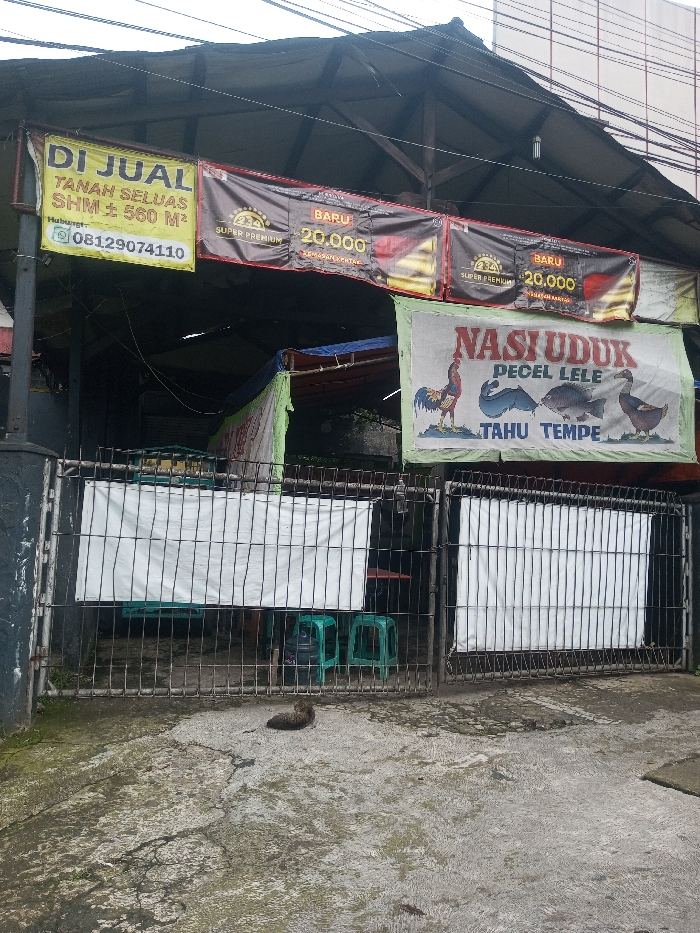 Located in Jabalpur, India, the image captures the exterior of a commercial establishment or food stall entrance under an overcast sky. The foreground features a cracked and damp concrete surface, where a brown cat is curled up and resting, facing towards the right. The midground is dominated by a dark metal gate with vertical bars, securing the entrance. Sections of the gate are partially covered by two plain white tarpaulins or fabric sheets. Behind the gate, visible through the bars, are two bright green plastic stools and a large clear water dispenser bottle. The main structure has a dark, possibly corrugated metal, roof supported by visible wooden or metal beams. Various tarpaulins (blue, green, orange) serve as makeshift walls or partitions for the interior space. Overhead, multiple electrical wires or cables traverse the frame. Several banners are affixed to the structure above the gate: * On the left, a yellow banner advertises "FOR SALE LAND AREA SHM +/- 560 M² Contact: 08129074110." * In the center, multiple dark banners with gold and red accents display "SUPER PREMIUM NEW 20,000 ECONOMIC PACKAGING." * On the right, a white banner with light green borders promotes Indonesian food items: "NASI UDUK PECEL LELE TAHU TEMPE," illustrated with a rooster, two fish (catfish and another), and a duck. No people are visible in the scene. The overall environment suggests a casual, possibly informal, commercial setting.