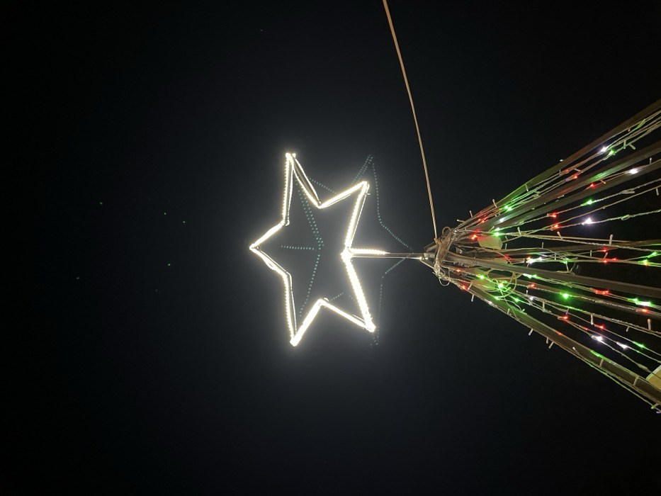 An upward shot at night showcases a large, illuminated star topping a cone-shaped Christmas tree