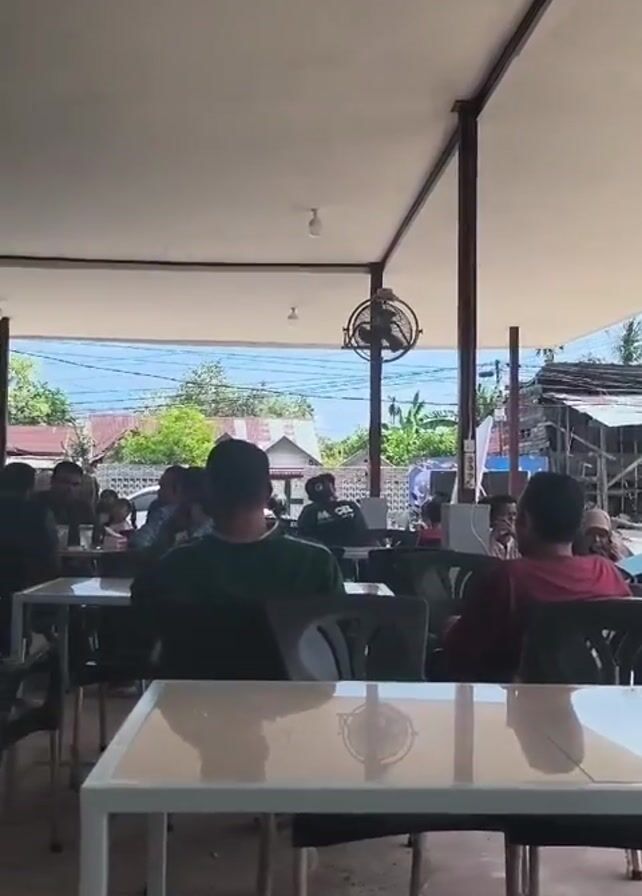 A wide, static shot shows a group of people seated at tables under a covered open-air patio