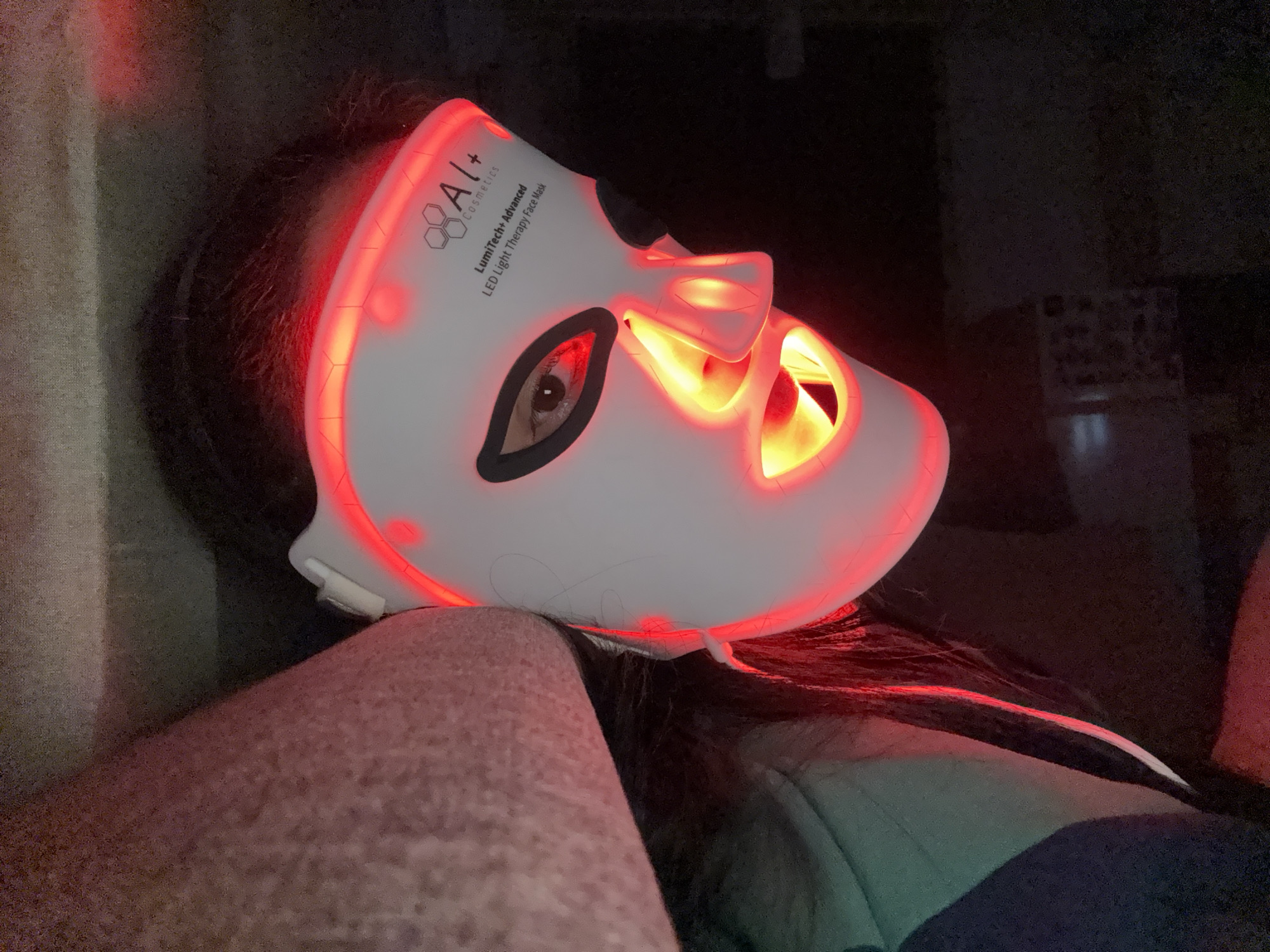 A person is wearing a white AI+ cosmetics LED light therapy face mask with glowing red and yellow lights