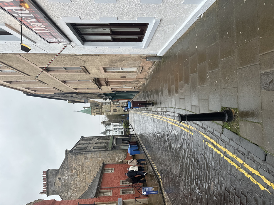 The image depicts a wet street scene in Dunfermline, United Kingdom, specifically looking northeast along High Street towards the Dunfermline City Chambers, identifiable by its green-turreted roof in the distance. The sky is overcast and grey. The cobblestone street, marked with double yellow lines, and the flagstone sidewalks are wet and reflective, indicating recent precipitation. On the left side of the street, a group of five individuals is walking away from the camera. They are wearing various coats, including dark, blue, and light-colored outerwear. Two blue wheelie bins are positioned near the curb on this side of the street. Buildings on the left include a red-painted lower section with stone upper levels, followed by a multi-story stone building with multiple chimneys. The right foreground features a white-rendered building with a dark-framed window. Above this, an illuminated sign displays "David G" in red text on a red tartan pattern, accompanied by a wall-mounted light fixture. Adjacent to this is a beige-colored building with multiple windows, from which a red and white striped pole extends diagonally. A dark-colored bollard is present on the wet flagstone sidewalk in the immediate foreground. Another dark bin is visible on the right sidewalk further down the street. In the far distance, the prominent Dunfermline City Chambers with its green turret stands amidst other traditional buildings. No vehicles are visible.