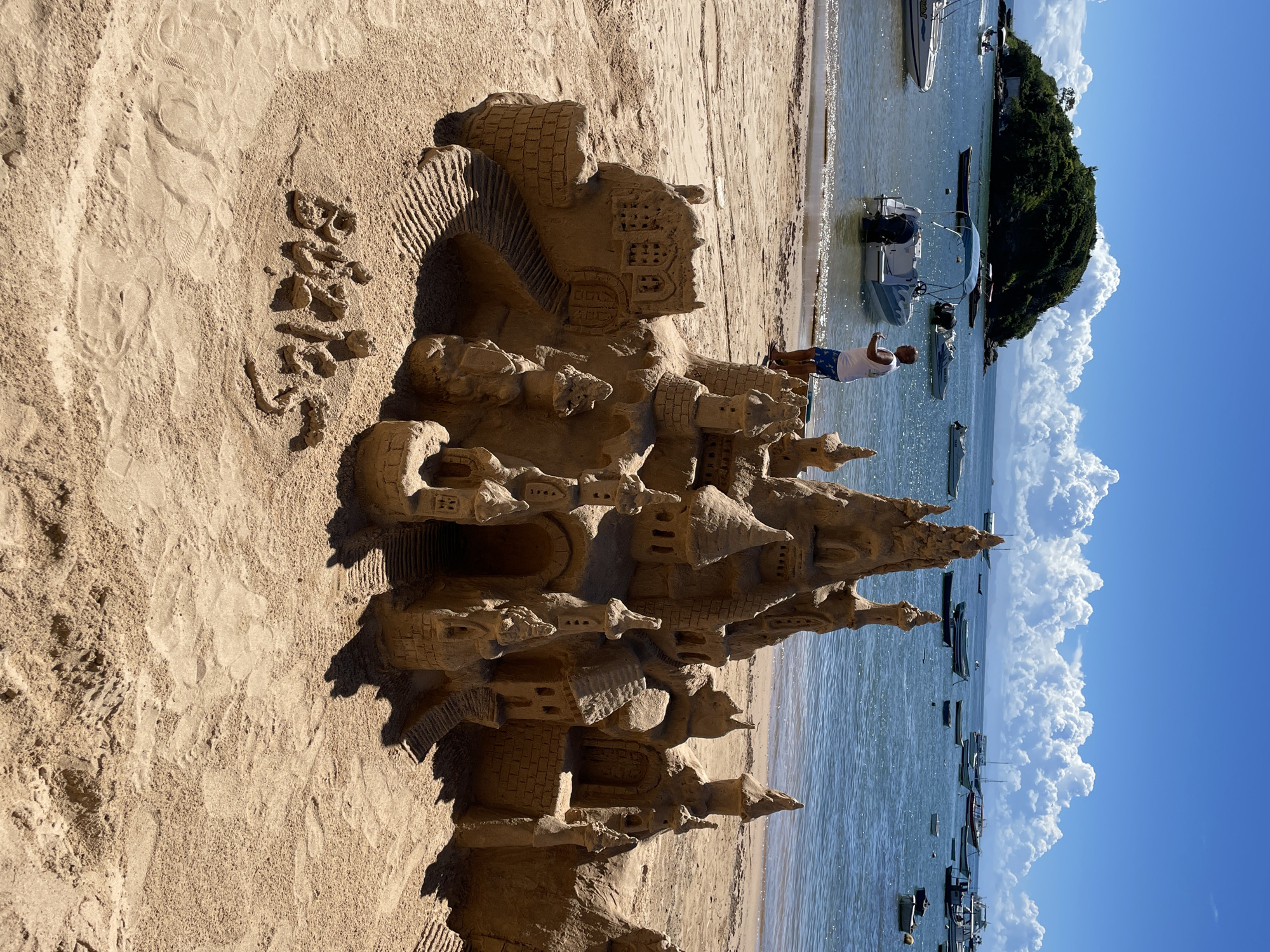 On a sunny beach in Armação Dos Búzios, Brazil, a large, detailed sandcastle stands prominently on the sand