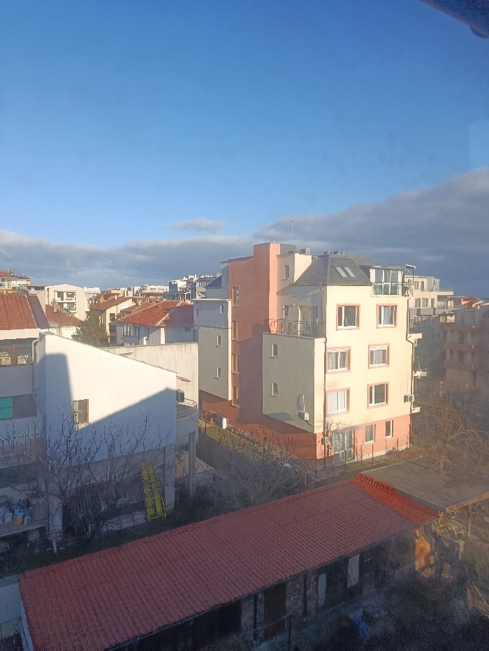The image depicts an elevated view of a residential area in Burgas, Bulgaria, under a partly cloudy sky