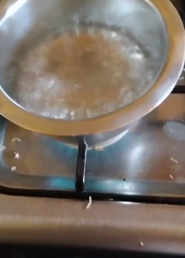 A small pot is on a gas stove with water boiling inside. The pot is silver in color and the stove is stainless steel. The burner is lit and the water is bubbling rapidly. There is some debris around the base of the pot on the stovetop. Another pot can be partially seen in the background.