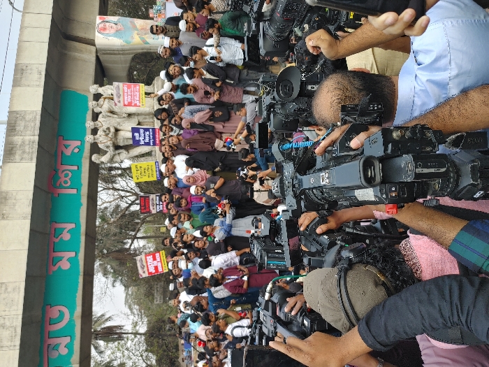 An outdoor public demonstration is depicted at the Raju Memorial Sculpture, Dhaka University, Dhaka, Bangladesh. The scene is set before a prominent multi-figure sculpture on a pedestal, beneath an overhead concrete structure featuring a green horizontal sign with Bengali script, notably displaying "স্মৃতিস্তম্ভ" (Smriti Stambha - Monument). A large crowd, predominantly male and of various ages, occupies the midground. Many individuals wear traditional Bangladeshi attire, including prayer caps (topis) and panjabis; several women are present, some wearing hijabs or burqas. Protesters are holding multiple placards: one red sign is visible with "JUSTICE FOR NURSING STUDENT" in English, while others feature Bengali text such as "নিরাপত্তা নিশ্চিত কর" (ensure security). A few individuals in the center of the protesting group are actively speaking into microphones, addressing the assembly. In the foreground, numerous media personnel are actively documenting the event. They are operating professional video cameras (camcorders) and holding microphones, clearly positioned to capture the protesters and their message. The hands and equipment of these media personnel dominate the immediate foreground. The environment is under natural daylight.