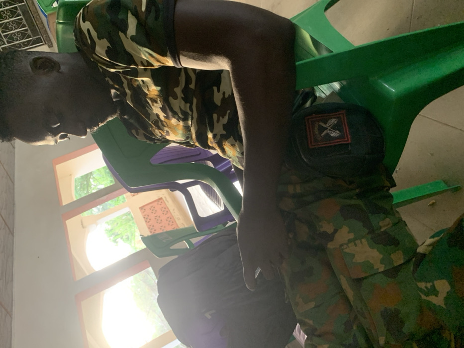 An individual wearing a camouflage uniform is seen in a brightly lit room. They rest their head on a green plastic chair. The person appears to be seated among multiple similar chairs, one of which is purple. A backpack sits nearby. The individual's uniform features a patch with crossed swords on the right sleeve. Outside the window, greenery is visible.
