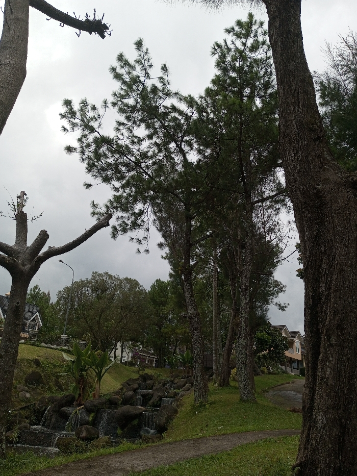 A tranquil scene features a multi-tiered waterfall cascading over dark rocks, flanked by lush green foliage. Towering trees frame the view, their branches reaching towards a cloudy sky. Residential houses are visible in the background. A path meanders through the grassy foreground.