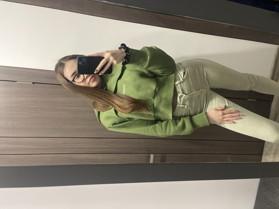 A young female subject is depicted in a mirror selfie, standing indoors in what is identified as Varna, Bulgaria. She has long, straight, light brown hair and wears dark-framed eyeglasses. Her attire consists of a cropped olive-green hooded sweatshirt featuring a horizontal cut-out design across the chest, where the word "KARMA" is visible in reverse due to the reflection. She is also dressed in light green skinny jeans. A black scrunchie is present on her left wrist. Her right hand holds a dark-colored smartphone, positioned to capture the image via the mirror. The background elements reflected include a paneled light brown wooden door with a horizontal silver handle, situated between white wall sections.