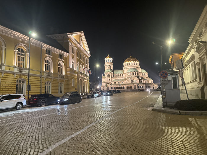 This image captures a nocturnal street scene in Sofia, Bulgaria, prominently featuring the St