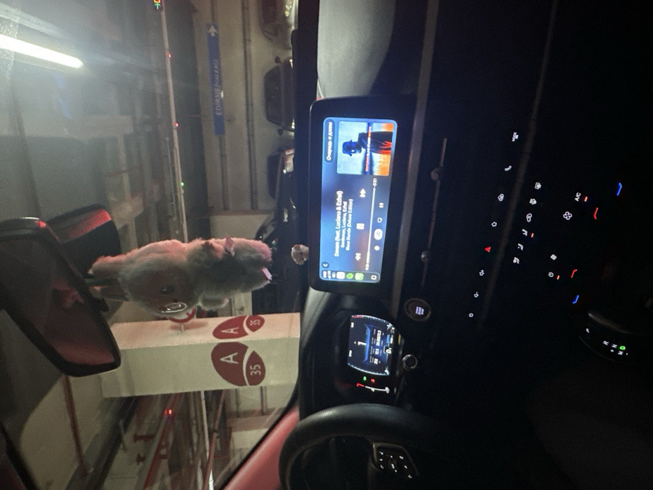 The image displays the interior of a stationary vehicle within a dimly lit underground parking garage