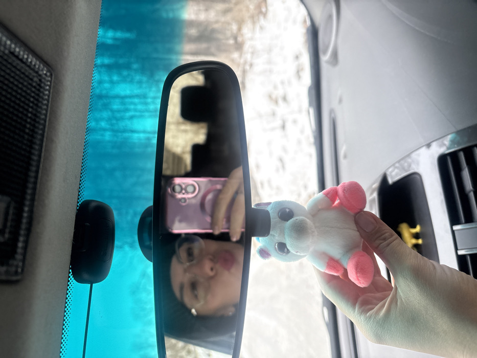 Inside a car, a rearview mirror reflects a person holding a pink phone, taking a selfie. A hand holds a small, plush unicorn toy with white fur and pink accents near the mirror. The dashboard is visible to the right, with air vents and a small, yellow figurine tucked inside a compartment. The windshield shows an unclear view of the outside, appearing blurry and out of focus.