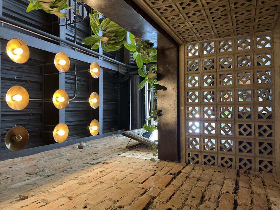 A ground-level shot of a space with brick flooring, an open ceiling with hanging disc lights, and greenery above. To the right, a wall made of square concrete blocks with diamond cutouts allows light to pass through. The space appears to be an indoor/outdoor setting with natural light visible through the wall. A dark steel structure frames the opening to the space, with more greenery draping over the side.