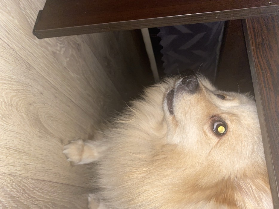 - "An indoor scene in Simeonovgrad, Bulgaria, depicts a light-colored, fluffy dog partially emerging from under a dark brown wooden furniture piece" by FM-WajJs2, licensed under CC BY 4.0