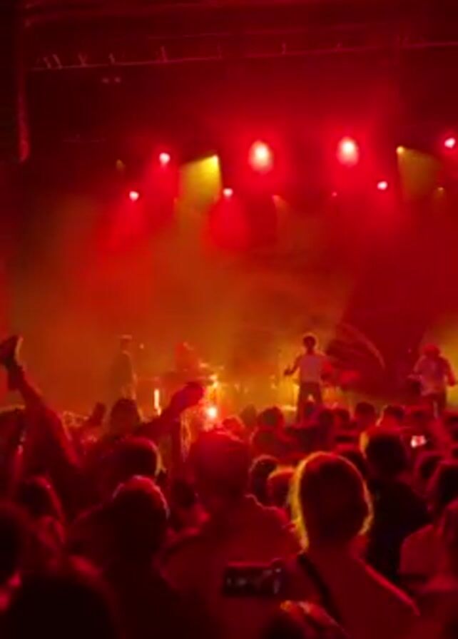 live band performing on a stage bathed in red and yellow lights. The stage is filled with the band members and their instruments. In front of the stage, a large crowd of people are visible, cheering and dancing. Many are holding up their hands and recording the performance with their phones. Some are even crowd-surfing. The overall atmosphere seems energetic and lively.