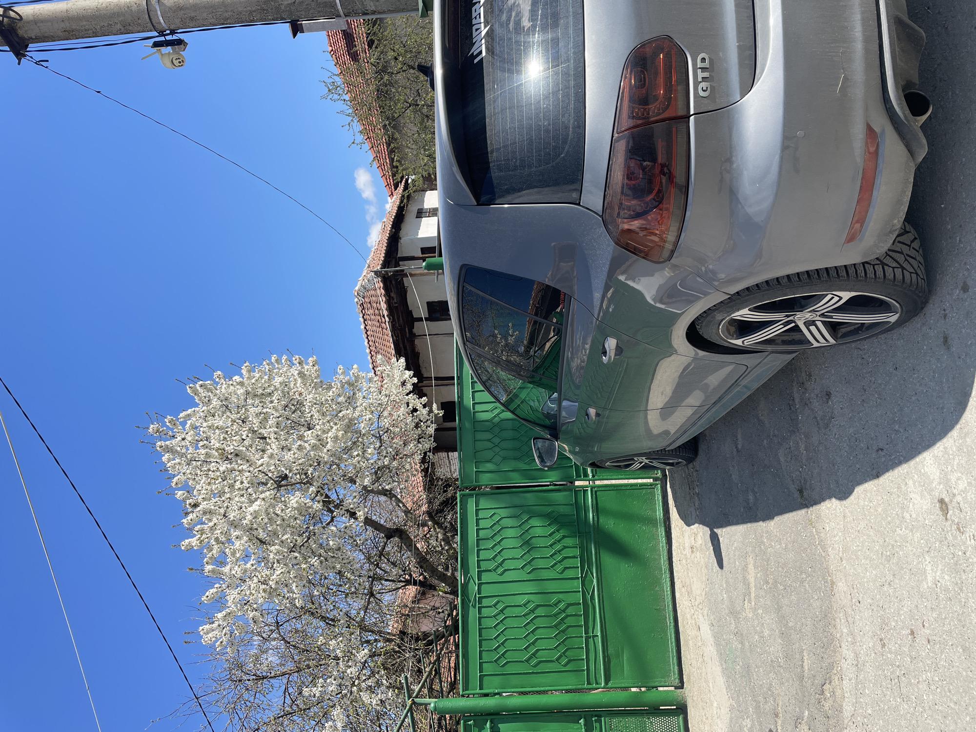 gray Volkswagen Golf GTD parked on a concrete surface in front of a green metal gate
