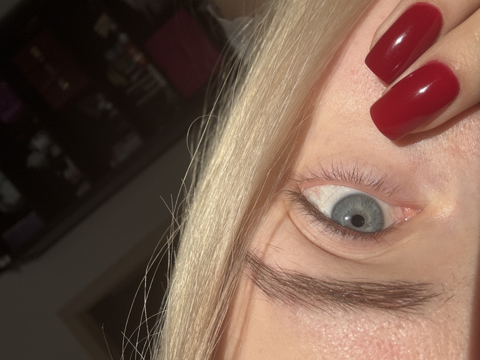 The image displays a close-up, angled view of a person's left eye and surrounding facial features. The subject exhibits light-toned skin, a defined dark brown eyebrow, and blonde hair primarily visible across the top and left of the frame. The left eye features a blue iris with a dark, circular pupil and distinct eyelashes on both the upper and lower lids. Two fingers, adorned with glossy red nail polish, are positioned to the right of the eye, lightly touching the skin near the temple or outer orbital area. Strong, direct lighting originates from the upper left, illuminating the eye and forehead, and casting a shadow from the hair onto the skin below. The background is dark and out of focus, containing indistinct shapes consistent with an indoor environment. Visible background elements include a blurry dark red rectangular object in the upper right quadrant and faint outlines suggestive of furniture or shelving with various items. An architectural outline, possibly a doorframe, is subtly present in the upper left background. The image does not contain visual information to determine its specific location within the city of Khimki, Russia.