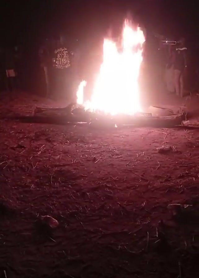 large campfire in an open, dark area