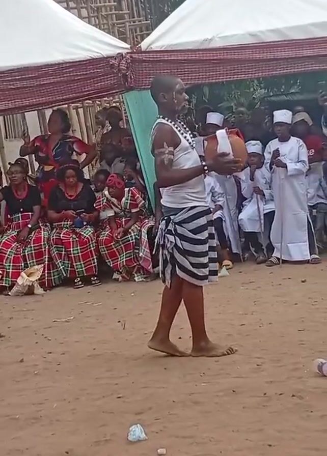 group of people gathered for what appears to be a traditional or cultural event. Several adults are dressed in white shirts and black and white striped fabrics around their waists. Some of them also have white feathers and clay pots balanced on their heads. They are dancing in a sandy area. A crowd of people, including children in white robes, are sitting and watching. There are tents overhead, suggesting an outdoor setting for the event. A sound system is playing music in the background.