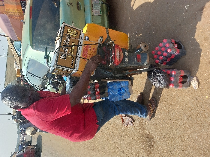 The image depicts an outdoor street scene in Akwanga, Nigeria, under clear, bright skies. A dark-skinned adult male, wearing a red short-sleeved collared shirt, blue jeans, and brown sandals, is positioned at the left side of a dark-colored motorcycle, bending forward as if adjusting its cargo. The motorcycle is heavily loaded with various goods secured by straps. Visible items include two large yellow boxes, one clearly labeled "Black Wood Bitters," and multiple plastic bags, including one containing blue-capped water bottles. Several individual Coca-Cola bottles in plastic packaging are suspended from the side of the motorcycle. On the dirt ground directly adjacent to the motorcycle's rear, two shrink-wrapped packs of Coca-Cola bottles are placed. A black plastic bag is resting on top of one of these packs. A small, light-colored object and a crumpled brown fabric item are also visible on the ground. In the background, a light green Peugeot vehicle, displaying a Nigerian license plate "AR 187KWA," is parked behind the motorcycle. Further down the street, additional vehicles, buildings with metal roofs, and market stalls with umbrellas are visible. Utility poles are present overhead.