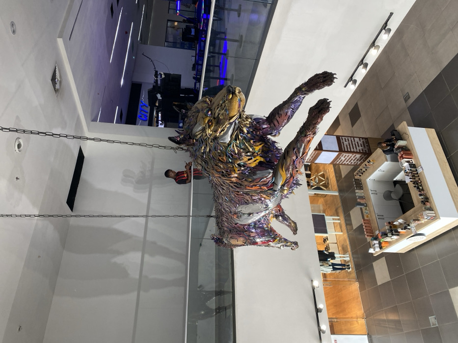 An elevated view captures the interior of a multi-level commercial building, identified as being in Moba, Nigeria. A large, dynamic sculpture of a wolf or dog, constructed from multi-colored, metallic, and reflective repurposed materials, hangs centrally from the ceiling by four heavy metal chains. The sculpture faces right, in a leaping posture. On an upper floor, a male individual in a dark shirt with red accents stands at a glass railing, looking downward or at a handheld device. His shadow is visible on the white wall behind him. This upper level extends into a background area with darker illumination, featuring blue and purple ambient lighting and structures suggestive of an entertainment or dining zone, with a partially visible "CITY" sign. On the ground floor, a white and light wood-toned U-shaped kiosk is positioned directly below the sculpture. It displays various bottles and products. A female individual with dark hair is seated at the kiosk, operating a laptop or similar device. Behind the kiosk, a store with wooden flooring and two mannequins is visible through a glass entrance. A tall, dark brown pillar with an ornate pattern stands near the kiosk. The floor is paved with large grey tiles. The building's interior features white walls and ceilings with integrated lighting fixtures.
