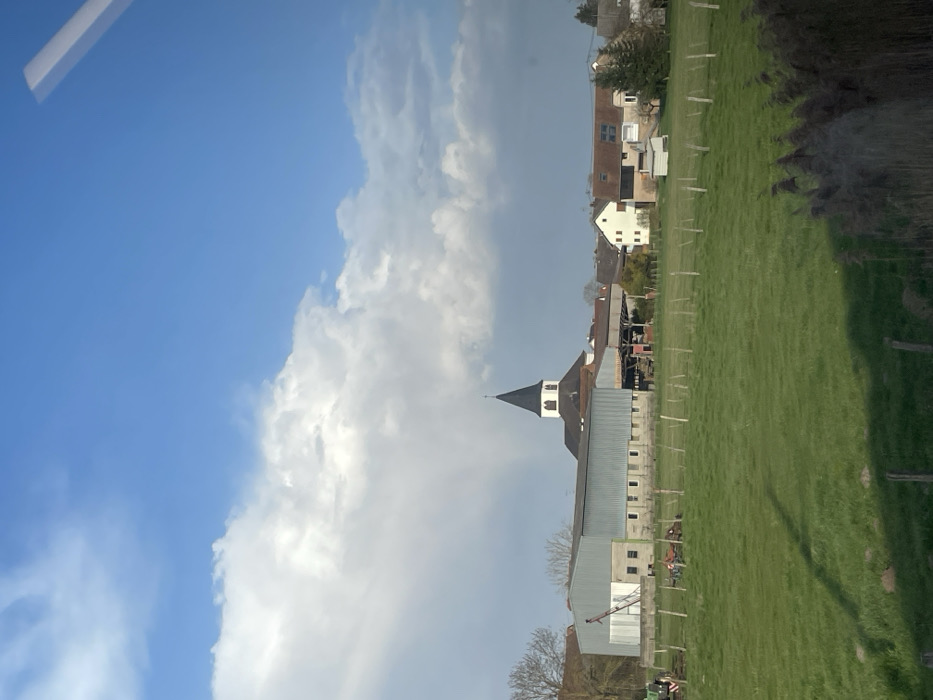 The image depicts a rural village landscape in Lupstein, France, under a partially cloudy sky. The foreground consists of a vibrant green pasture dotted with numerous slender wooden fence posts. Dark, reedy vegetation is present along the bottom edge of the frame. In the midground, a large, rectangular, light-grey corrugated metal building, consistent with an agricultural barn or storage facility, is situated on the left. This structure features multiple rectangular windows along its side. A red and white mechanical arm or lift extends upwards from the building's left side. A green tractor is partially visible near the base of this structure, with two indistinct figures in dark clothing standing in proximity. To the right of the main building, another open-sided structure with a dark roof is present. The background is dominated by a white church with a tall, black conical steeple, surmounted by a cross, positioned centrally. Surrounding the church are several residential houses of various designs, typically featuring light-colored facades and brown pitched roofs. Scattered deciduous trees, currently bare, are visible among the buildings. The sky exhibits patches of clear blue on the right, transitioning to substantial white and grey cumulus clouds across the center and left. A faint, vertical shaft of light appears to descend from the clouds behind the church steeple. Illumination suggests late afternoon or early morning, with long shadows cast across the field.