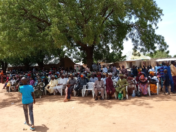 large gathering of people in Zum, Nigeria, situated at the coordinates 10.116 latitude and 13.046 longitude. The majority of the attendees are seated on white plastic chairs under the shade of a large tree, with some standing on the periphery. The individuals are dressed in a variety of traditional attire, reflecting the diverse cultural background of the gathering. There is a young boy in a blue shirt standing in the foreground, facing the viewer, while the majority of the attendees are looking towards a point outside of the image's frame. The ground is a mix of dirt and grass, indicating an open-air location. There are several small buildings in the background, suggesting a rural setting.