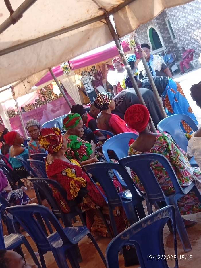 Under a tent decorated with pink fabric and flowers, a group of women wearing colorful traditional African clothing and headwraps sit in blue plastic chairs. They appear to be attending an outdoor event. A building with a distinctive arched window is visible in the background. The date and time 19/12/2025 15:15 are stamped on the lower right corner of the image.