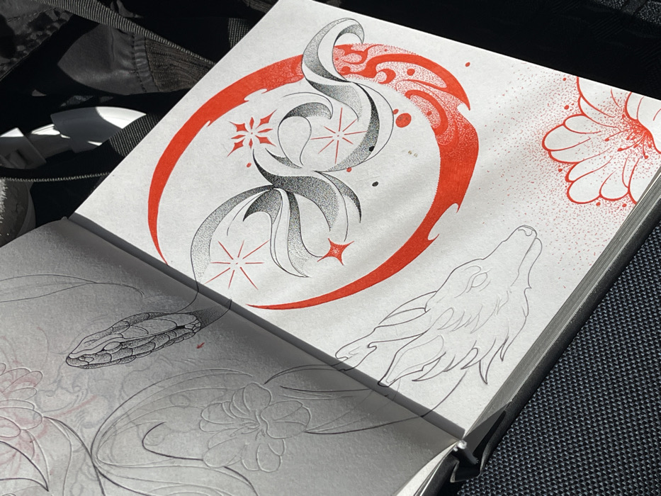 - "An open white sketchbook, located in Aksay, Russia, displays multiple intricate tattoo designs" by FM-BhCGm1, licensed under CC BY 4.0