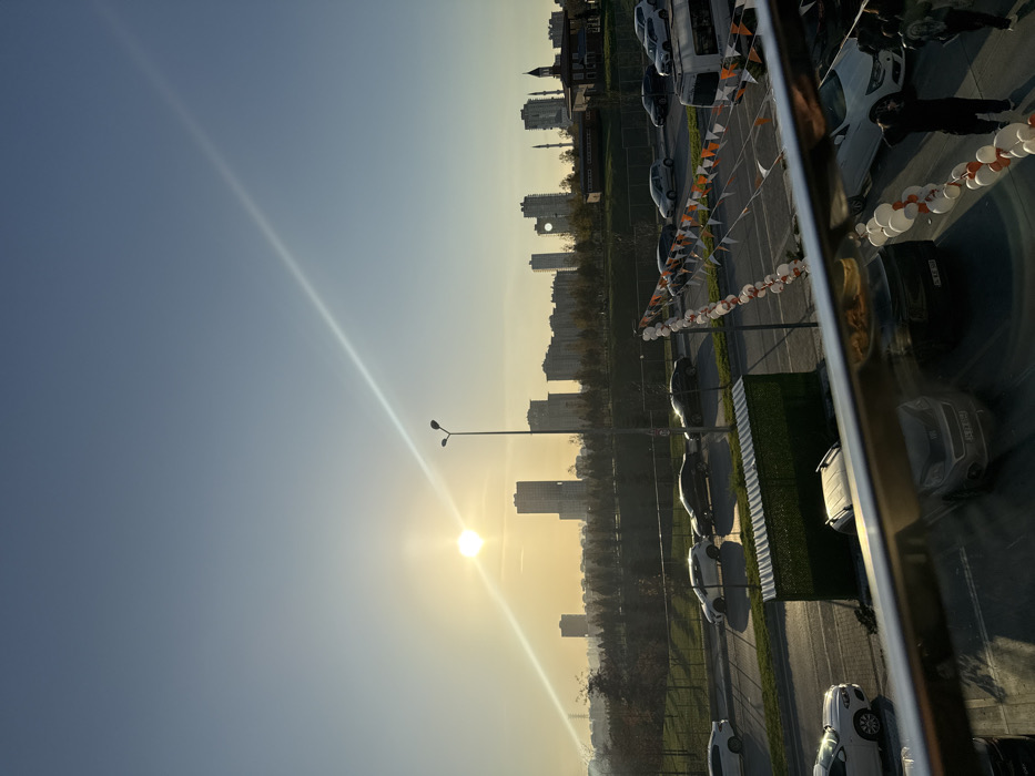 The image depicts an urban landscape in Başakşehir, Turkey, observed from an elevated perspective during either early morning or late afternoon, characterized by a low sun creating a prominent lens flare. The sky is a clear, light blue, with the bright sun positioned near the left horizon, generating a strong, diagonal light streak across the upper portion of the frame. In the immediate foreground, a reflective metal railing partially obstructs the view. Below this railing, parts of parked vehicles, including a grey hatchback, are visible. Several individuals in dark clothing are partially obscured by the railing and festive decorations in the lower right, standing near parked cars. A multi-lane asphalt road traverses the midground, with multiple vehicles, including a white SUV, black sedans, and a white commercial van, either parked or in motion. A single street light pole with two lamps stands on the road's left side. Strung above an area near the road are decorative lines of alternating white and orange balloons and triangular pennants, indicating a festive setting. A low, green, artificial hedge-like barrier is situated between a parking area and the road. Beyond the road and a grassy median, a park area with scattered trees and a dark fence line extends. The distant background reveals a dense urban skyline composed of numerous high-rise buildings. Notable structures include a tall, slender skyscraper on the left, a building with a distinct circular opening in the center-right, and a mosque featuring two minarets further to the right, confirming the location as Başakşehir, Turkey.