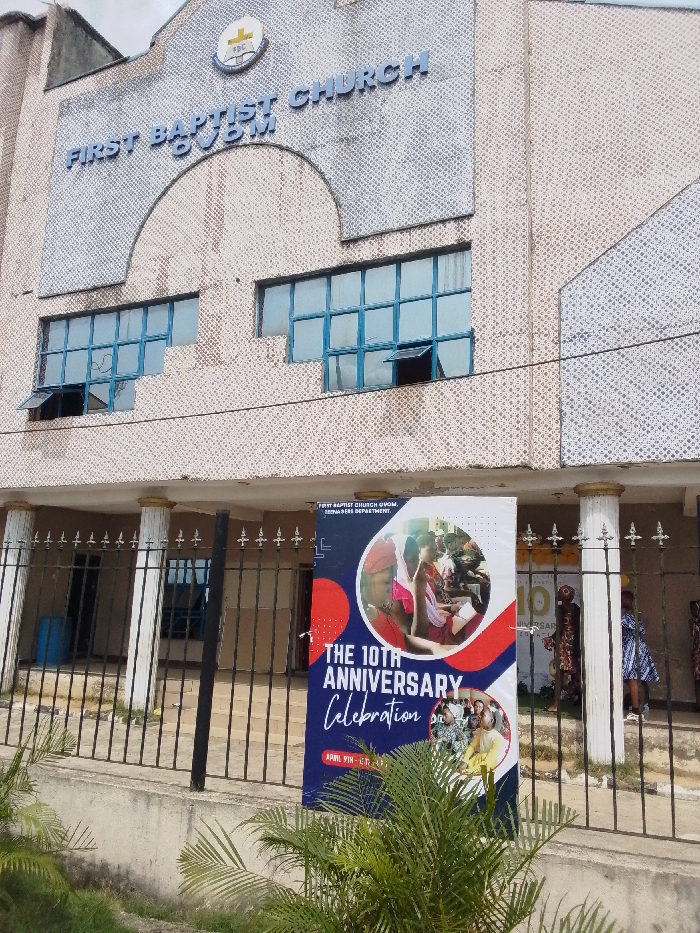 exterior of the First Baptist Church, Gwoin, located in Yenagoa, Nigeria, at the coordinates 4.931, 6.268. The church is a two-story building with a white facade, decorated with a patterned design. The front of the building is partially obscured by a black metal gate and a large banner announcing the church's 10th anniversary celebration. The banner features a group of people, likely church members, gathered in an outdoor setting. Several people, including men, women, and children, stand behind the banner, potentially waiting to enter the church. The surrounding area is a green, grassy field with some landscaping. A blue, possibly plastic, barrel rests in front of the church. The building's roof has a slight overhang above the gated entrance.