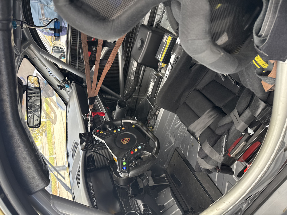 This image captures the stripped-down interior of a Porsche race car, observed from a slightly elevated perspective within the vehicle