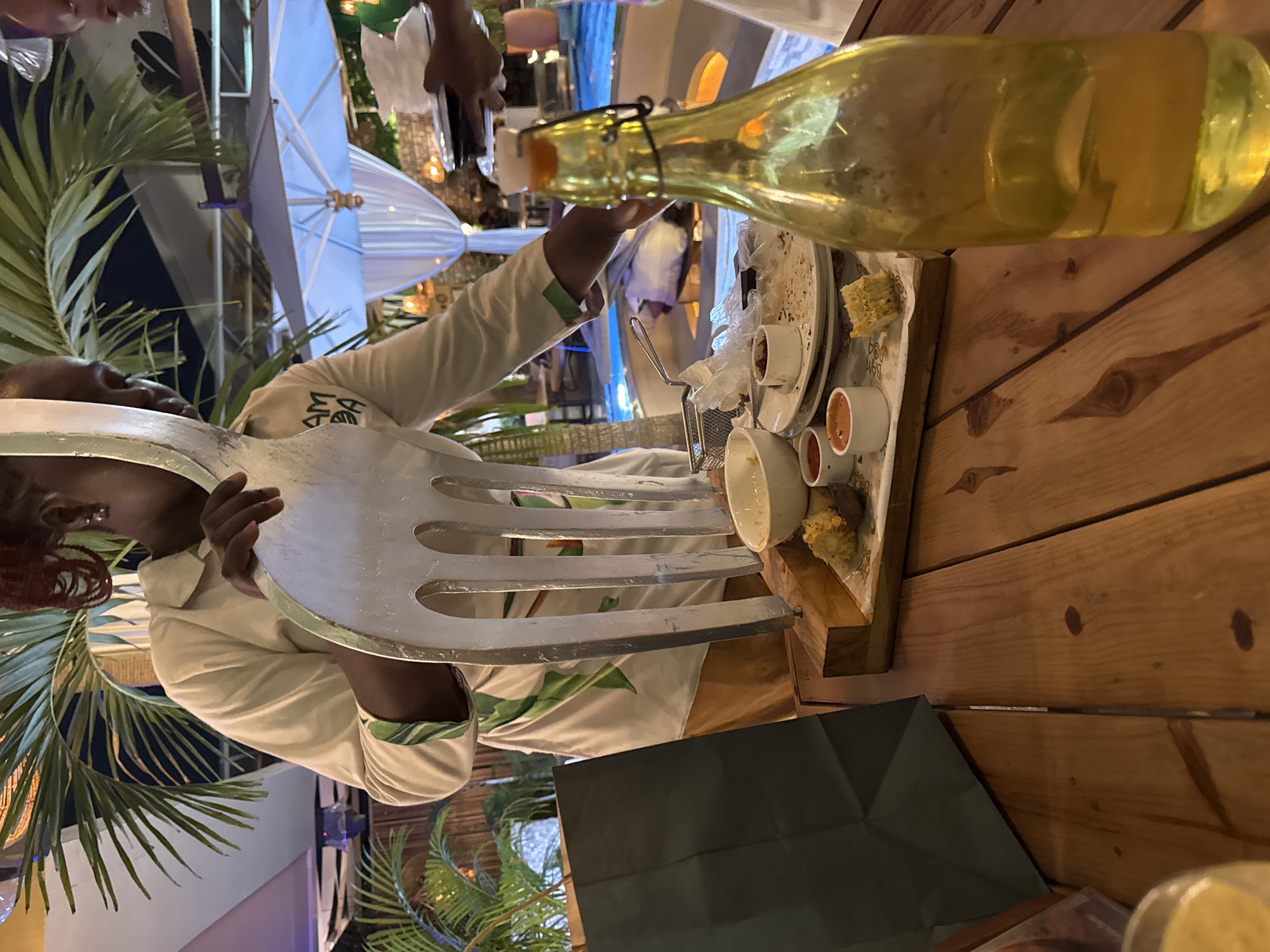 A woman stands outdoors, holding a large, ornamental fork. A table is next to her with a half-empty glass bottle, plates, and bowls of food. Trees are visible in the background, and a white tent-like structure. This is likely at a restaurant or event in Itirin, Nigeria.
