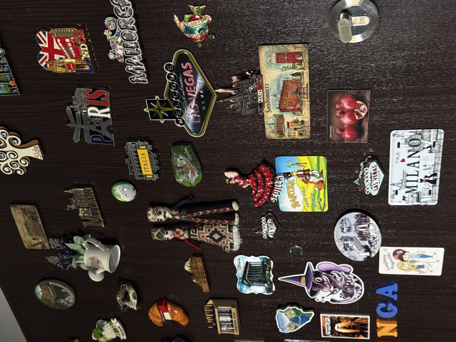The image presents a dark brown, vertically textured wooden panel, likely a refrigerator door or cabinet, located within a private residence in Tarnów, Poland. The panel is heavily adorned with a dense, eclectic collection of souvenir magnets from various global and domestic locations. Prominent magnets include metallic representations of "MILANO," "PARIS," and the "Welcome to Fabulous LAS VEGAS NEVADA" sign. Other international magnets depict a Union Jack flag with London landmarks, "MALLORCA" text, an "ITALIA" train, a "Le Mont-Saint-Michel" scene, and a "Side" tree design. Figurative magnets include a white watering can with purple flowers, a green shamrock labeled "Zakopane," a silver masquerade mask, an orange croissant with a French flag, a mountain labeled "Urumqi," and a red dress flamenco dancer from "SEVILLA." A pair of dolls in traditional attire, a "GERHARD" landscape, a "ARMENIA WINE" cabinet, and pomegranates represent Armenian souvenirs. Polish-specific magnets include a "Sandomierz" cityscape and a "Bartek" cartoon figure. A white rectangular magnet features two cartoon women with the Polish phrase "Na najlepsze przyjaciółki!" Additionally, there is a circular magnet with a cartoon cat face and a purple witch-hatted creature. On the far right side of the lower frame, a silver-toned cylindrical door lock mechanism, complete with a keyhole and a thumbturn, is integrated into the wooden surface. No individuals are present in the scene, and no actions or interactions beyond the static display of magnets are depicted.