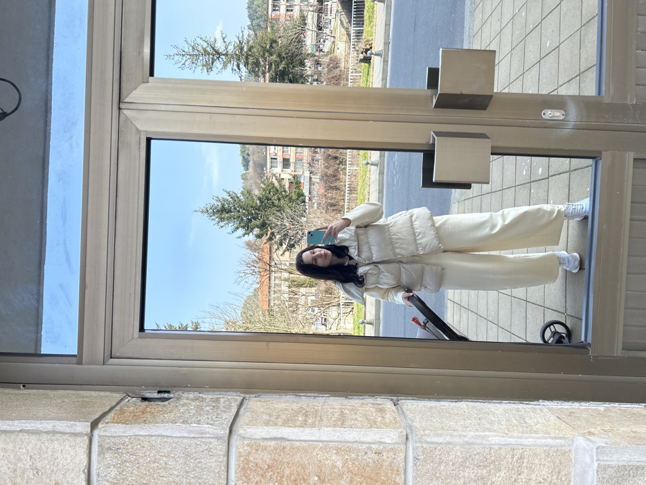 A woman is depicted taking a mirror selfie in Zlatograd, Bulgaria. She stands indoors, reflected in a glass door with a light-colored metallic frame. The woman has dark hair and is wearing a cream-colored ensemble consisting of a puffer vest over a long-sleeved top and wide-leg trousers, paired with white sneakers. She holds a turquoise smartphone in her right hand, angled to capture her reflection. Partially visible to her left is the handle and wheel of a black stroller with a red accent. A stone-clad wall is adjacent to the door frame on the left. The reflected outdoor environment features a clear blue sky over a city street. In the background, various buildings are visible, including a multi-story structure with a light facade and reddish roof on the left, and other residential-style buildings further back. Prominent evergreen trees, along with deciduous trees with bare branches, are scattered across the landscape. Vegetated hills rise in the distance. A paved street with a white fence and bollards runs across the midground. The ground visible in the reflection, beneath the woman, is paved with square tiles.