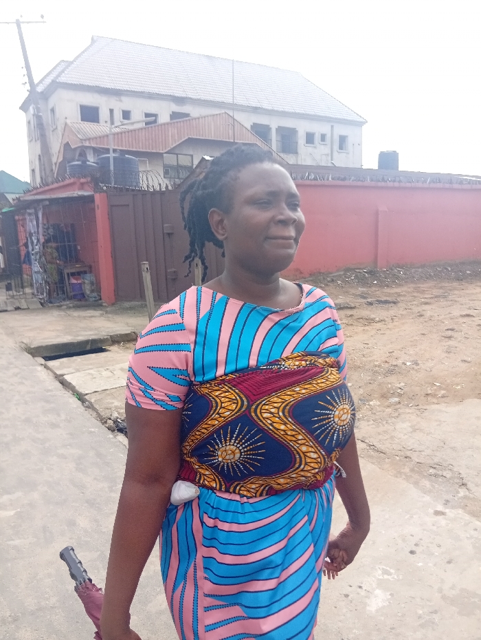 An outdoor scene in Aba, Nigeria, depicts an adult female standing on a concrete pathway, looking slightly to her right with a neutral expression