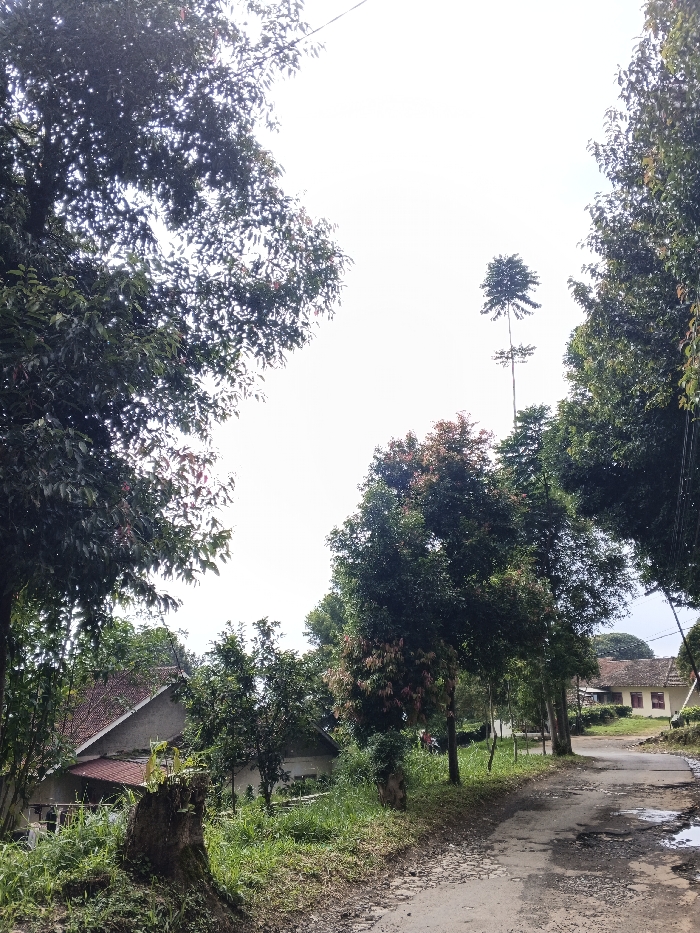 A road winds through a lush, green landscape with houses visible on either side. Dense trees frame the scene, reaching towards the overcast sky. A uniquely tall, thin tree stands out in the distance. Vegetation grows freely along the roadside. The road surface is cracked and shows signs of wear.