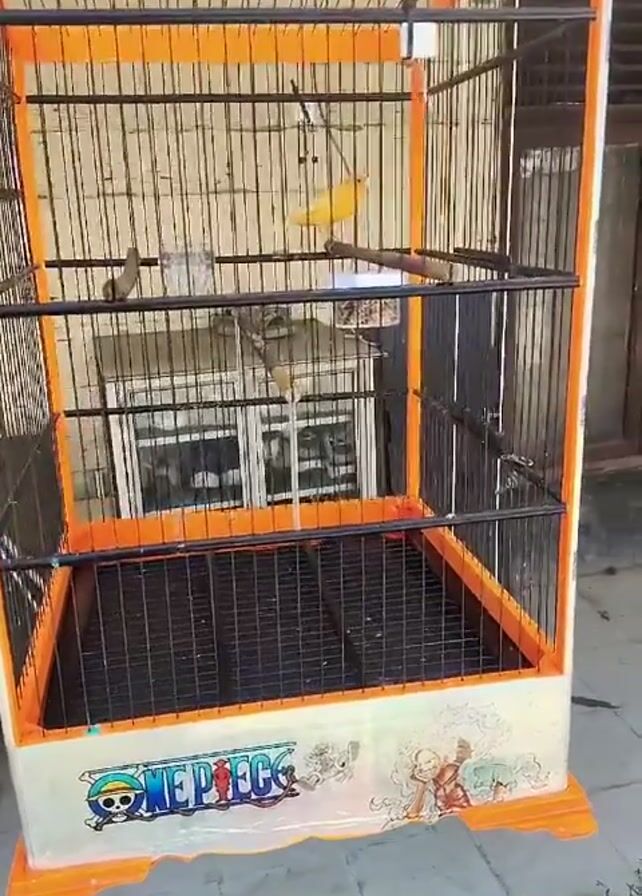 A birdcage with a black grid floor and two birds sitting inside is the primary focus of the video. The cage is painted in white and orange colors, with "One Piece" decals applied to the top and bottom. The cage features black metal bars. The background behind the cage includes a windowed cabinet, an outdoor patio, and a fence. The camera moves around the cage, showing it from different angles.