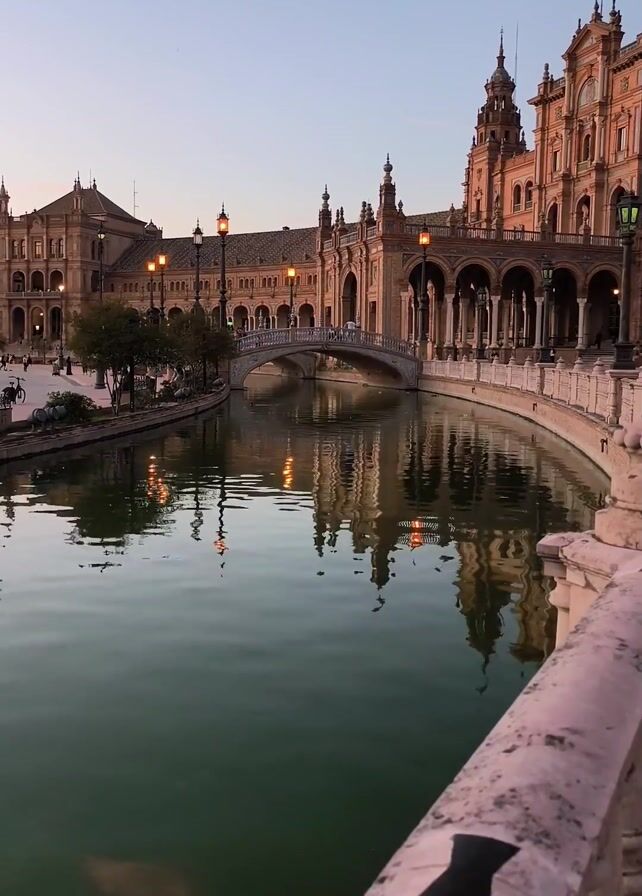 still, low-angle shot of the Plaza de España in Seville, Spain, during dusk. The architecture of the Plaza is visible, showcasing an ornate building with towers, arches, and colonnades. A canal filled with water reflects the building and the surrounding lamp posts. A bridge crosses the canal. The sky is a soft gradient of blue and pink. There are people walking around the plaza and on the bridge. A marble balustrade is in the foreground. The canal water appears to be a greenish hue.