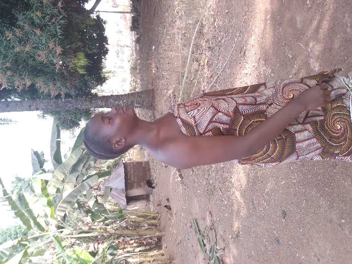 A young woman stands in a rural landscape, possibly Africa. She wears a colorful patterned cloth wrapped around her torso. Her hair is neatly braided. Her gaze is directed upwards, possibly toward a tall tree. Banana plants and a simple structure with a corrugated roof are visible in the background. The ground appears to be a combination of dirt and scattered debris. Sunlight casts shadows across the scene.