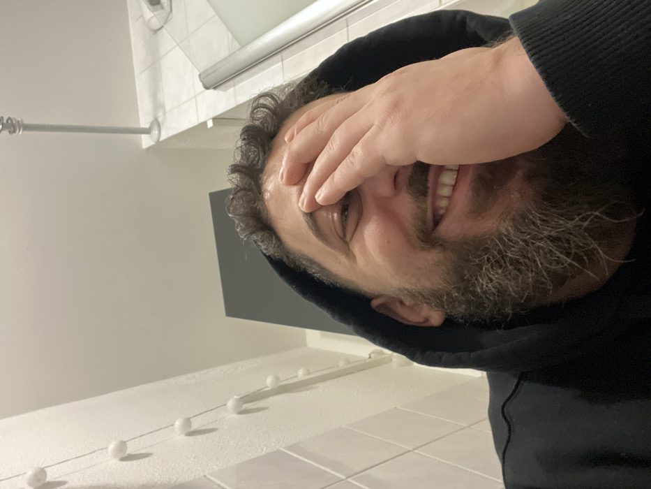 A man with curly dark hair and a beard partially covers his face with his hand, smiling. He's wearing a black hooded sweatshirt. The image is taken from a low angle, looking up at the man. In the background, there's a white tiled wall with a shelf holding small white balls strung along a line. Above the shelf is a gray rectangle. In the upper left, there's a metal bar and part of a white, angular surface.