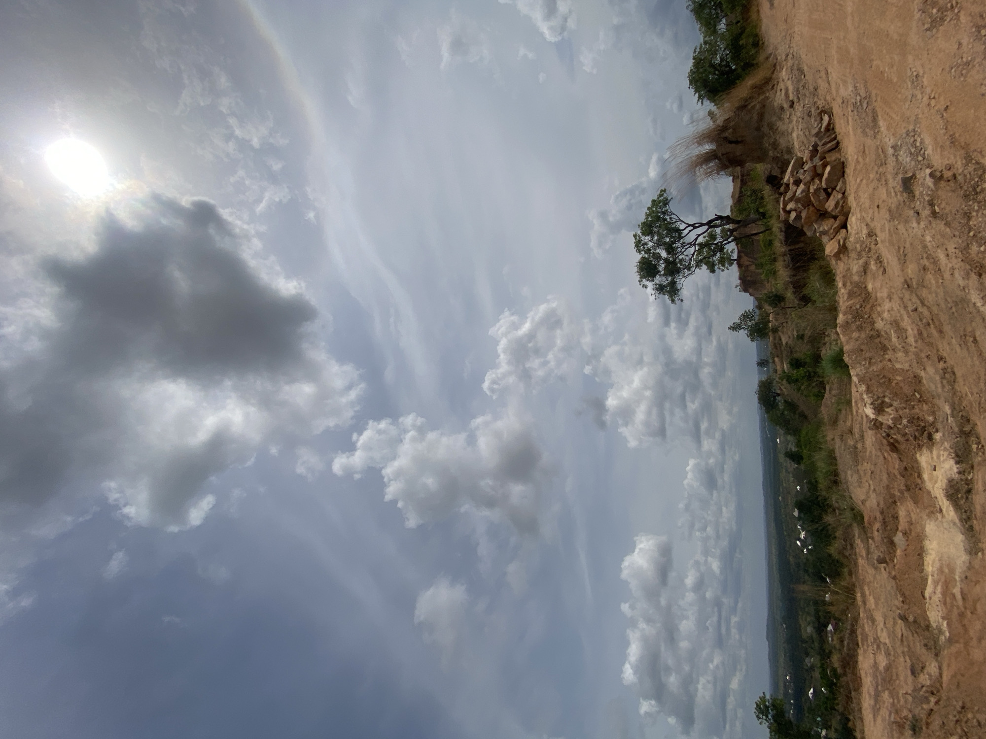 An elevated outdoor scene in Achara, Nigeria, captures a wide landscape under a partially cloudy sky with the sun visible in the upper right. The foreground features a reddish-brown dirt path or excavated earth, with a pile of approximately 15-20 irregular light-brown rocks stacked on the right side. Behind the rocks, a steep dirt bank supports tall, dried grasses appearing to be wind-swept towards the right. A medium-sized tree with green foliage stands on a higher earth bank slightly left of center. The midground reveals a vast expanse of lush green vegetation, interspersed with scattered white-roofed structures, indicative of a settlement. The background consists of a predominantly grey sky with white cumulus clouds, and a bright, overexposed sun partially obscured by cloud cover. No individuals or specific actions are discernible.