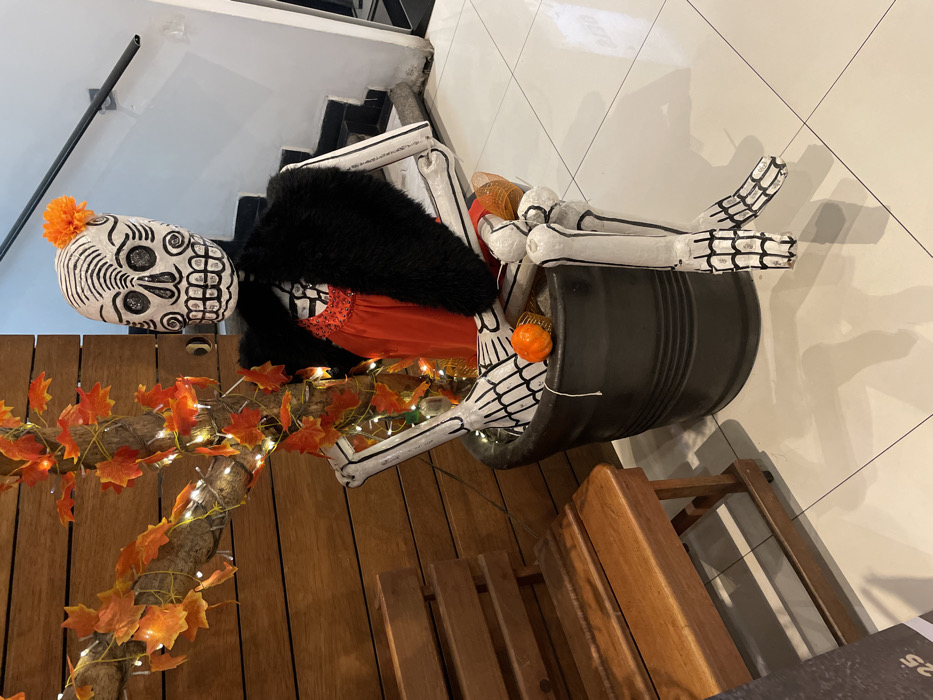 An artificial skeleton figure, resembling a Catrina, is seated within a large, dark gray planter on a white tiled floor in Puebla City, Mexico. The figure is predominantly white with black facial features and bone markings, adorned with an orange floral ornament on its head, an orange, sequin-embellished dress or top, and a black faux-fur shrug. Its legs and arms are positioned within the planter, with its lower legs and feet extending over the planter's edge. A small, orange, round decorative object rests inside the planter near the skeleton's body. To the immediate left, a natural wood slat wall serves as a backdrop, against which a simple, unpainted wooden bench with horizontal slats is placed. Behind the skeleton and emerging from the planter area is a tree branch wrapped with string lights and artificial orange autumn leaves. To the right of the skeleton, a white wall with a dark gray handrail indicates the presence of a staircase ascending towards the upper right. The floor is composed of large, light-colored square tiles with visible grout lines, reflecting ambient light and showing shadows cast by the objects.