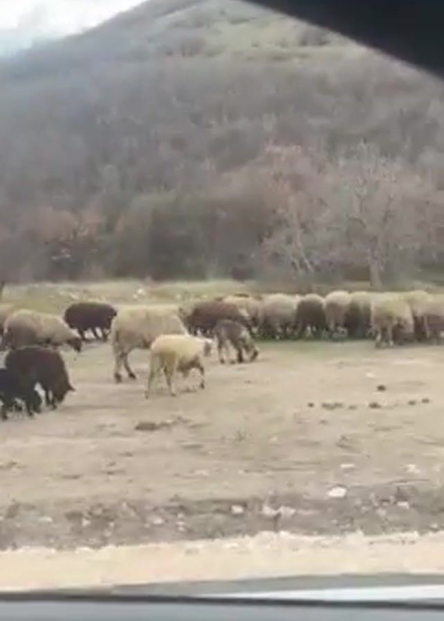 From the inside of a vehicle, a scene is visible showing a herd of sheep grazing in an open, barren field