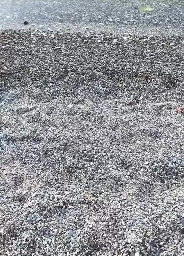 The video begins with a close-up of a gray, pebbled beach, followed by a pan upwards to reveal calm water and mountains in the background